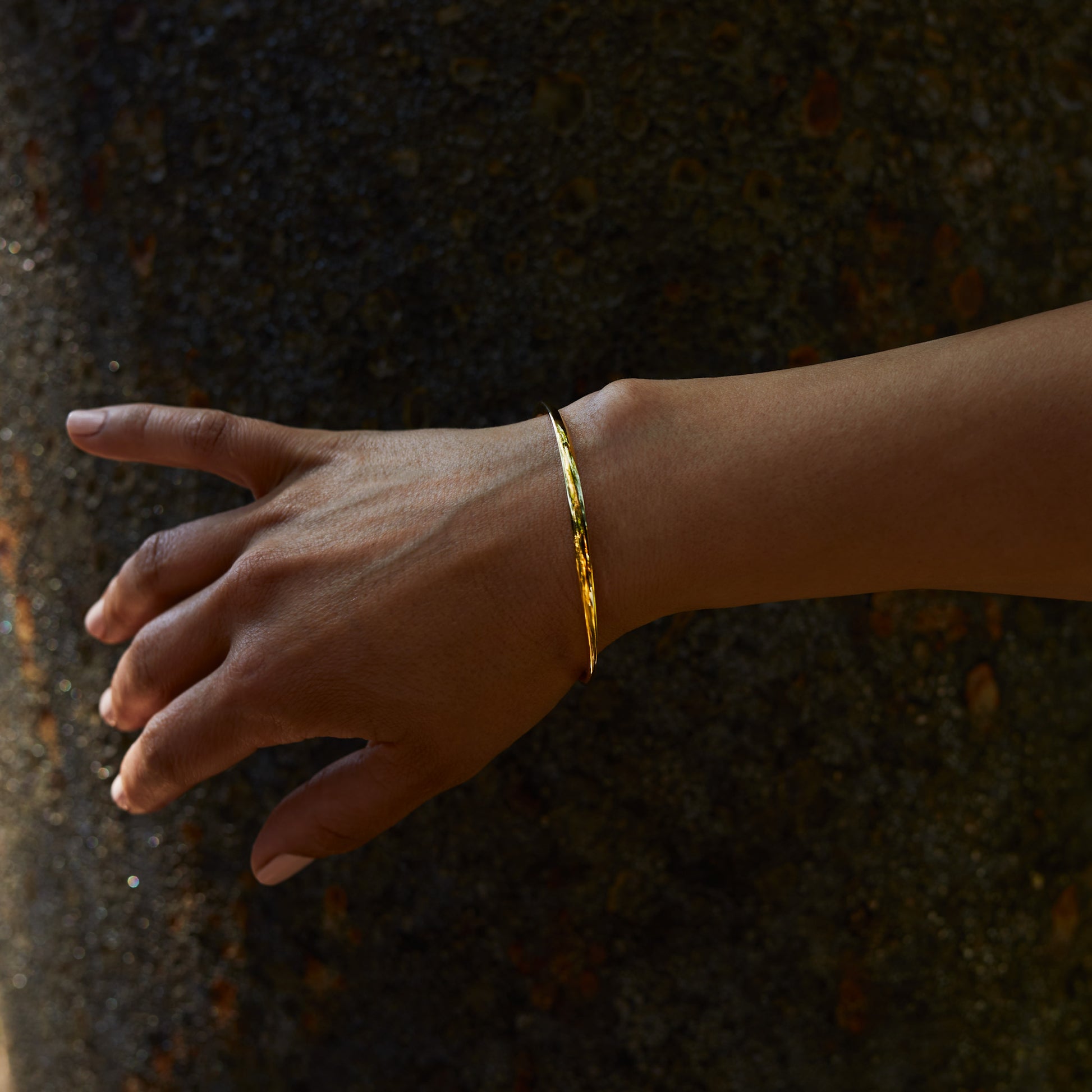 Sleek and contemporary, this slip-on bangle is crafted in sterling silver with a luxurious 14k yellow gold vermeil finish. The clean, minimalist silhouette makes it a versatile accessory — easy to wear alone for understated elegance or stacked for a modern layered look. A timeless piece that transitions effortlessly from day to night.